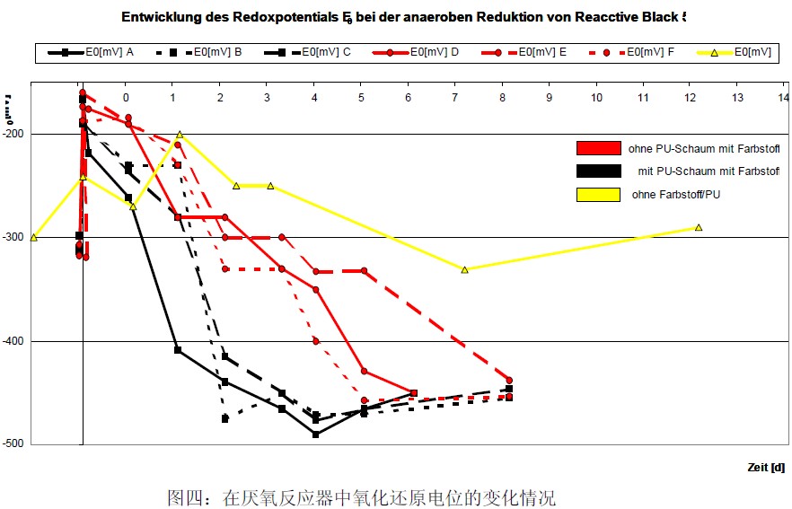 使用LEVPAOR 生物膜技术偶氮类物质的降解速度和氧化还原电位的减少速度更快表明其中存在一定的关联。偶氮类物质的降解是因为偶氮基团被还原为氨基,从而电位降低。